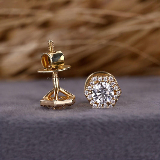 Round Cut Lab Grown Diamond Stud Earrings - Halo Screw Back Earrings