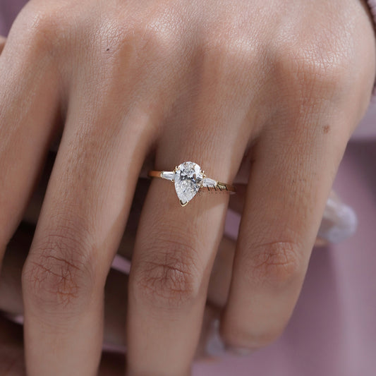 Liquid error (snippets/card-product line 147): Could not find asset snippets/opinew_review_stars_lists.liquidMoissanitePear Cut Moissanite Three Stone Engagement Ring with Tapered Baguette Side Stones