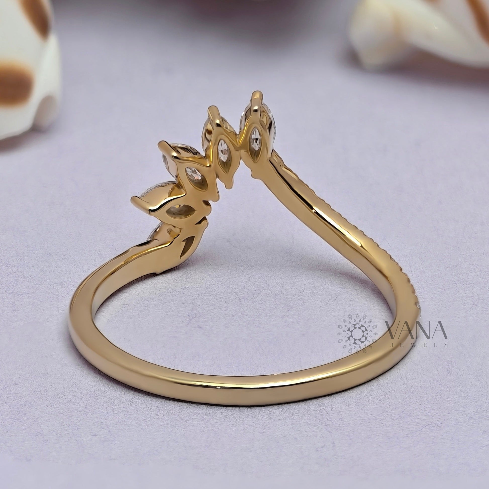 Curved Tiara Wedding Band, Marquise and Round Cut Moissanite Chevron Ring