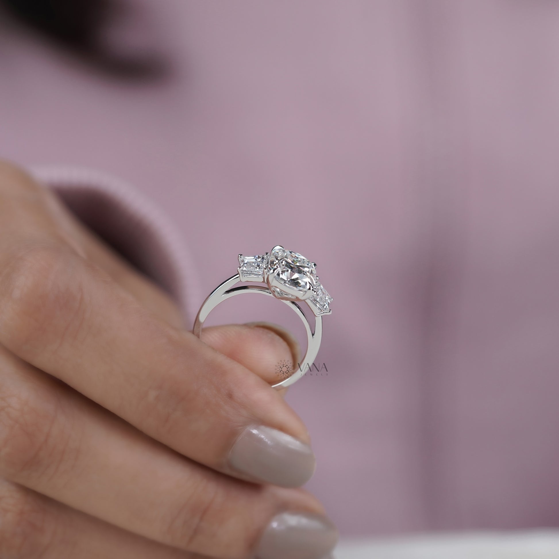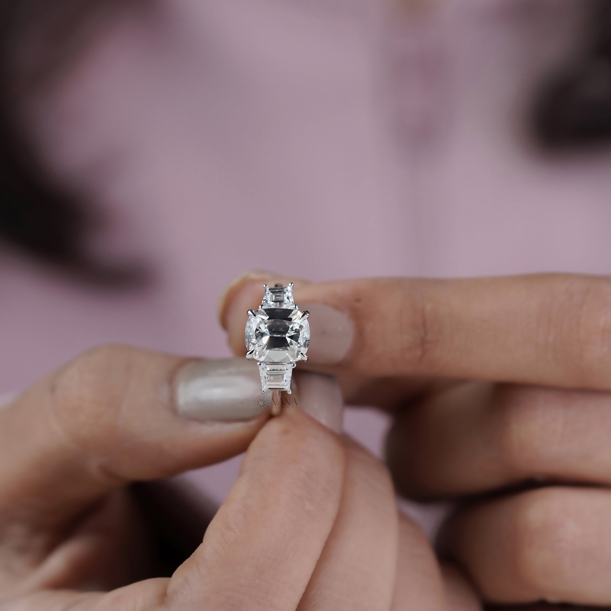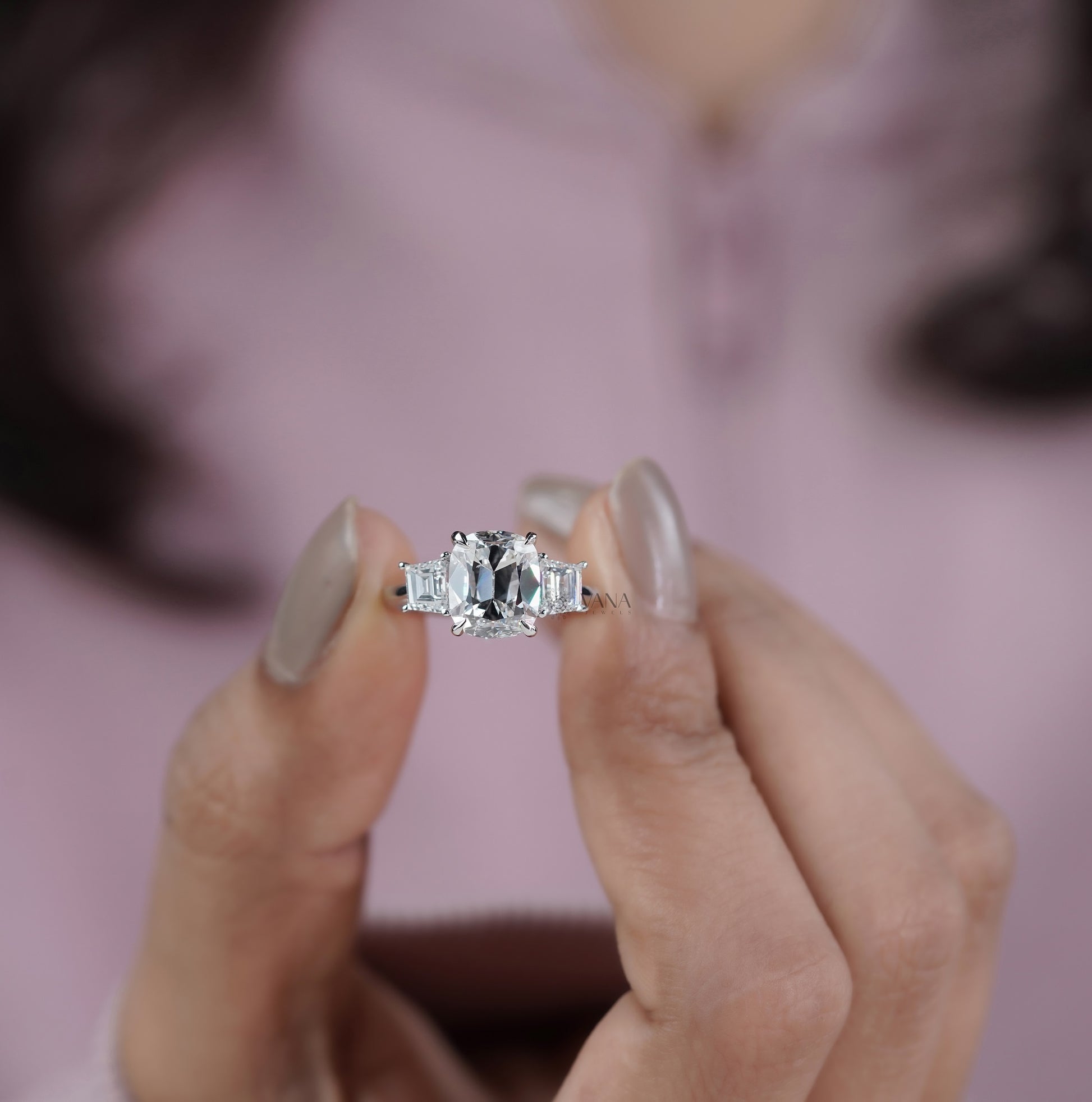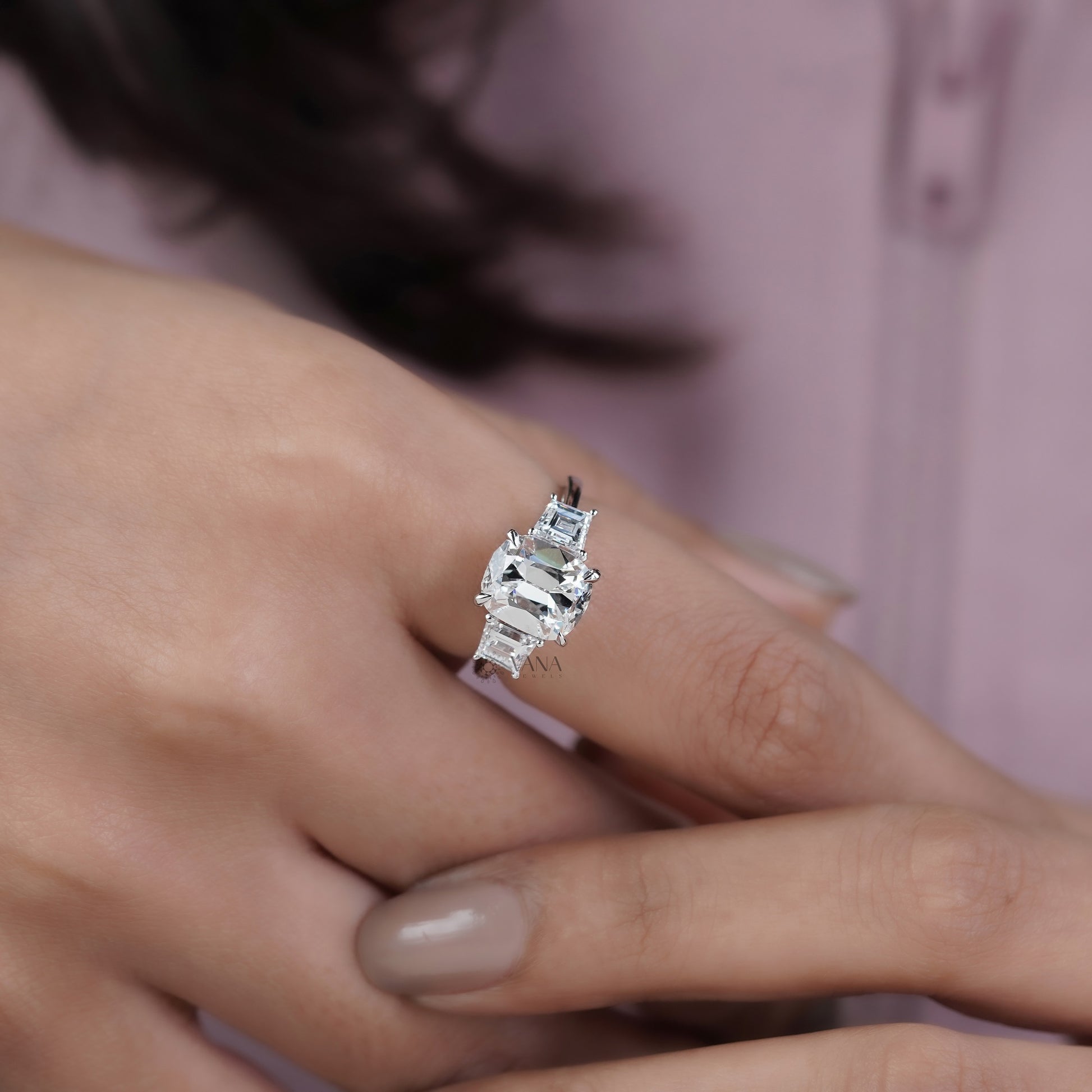 This stunning three stone engagement ring features a brilliant cushion old mine cut lab grown diamond as the center stone, celebrated for its vintage charm and soft, romantic sparkle. Flanked by elegant trapezoid side diamonds, the trilogy design symbolizes past, present, and future love. Expertly handcrafted, this ring blends timeless elegance with modern sustainability. Perfect as an engagement, promise, or anniversary ring, it is a meaningful gift she will treasure forever.