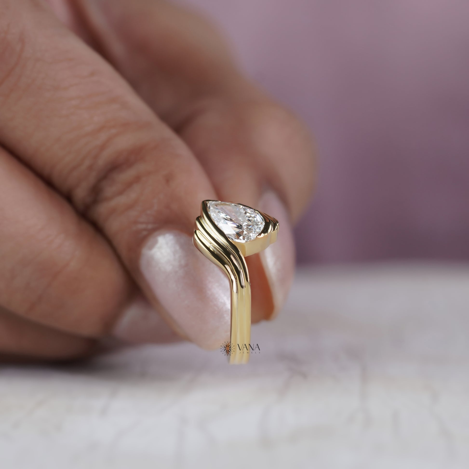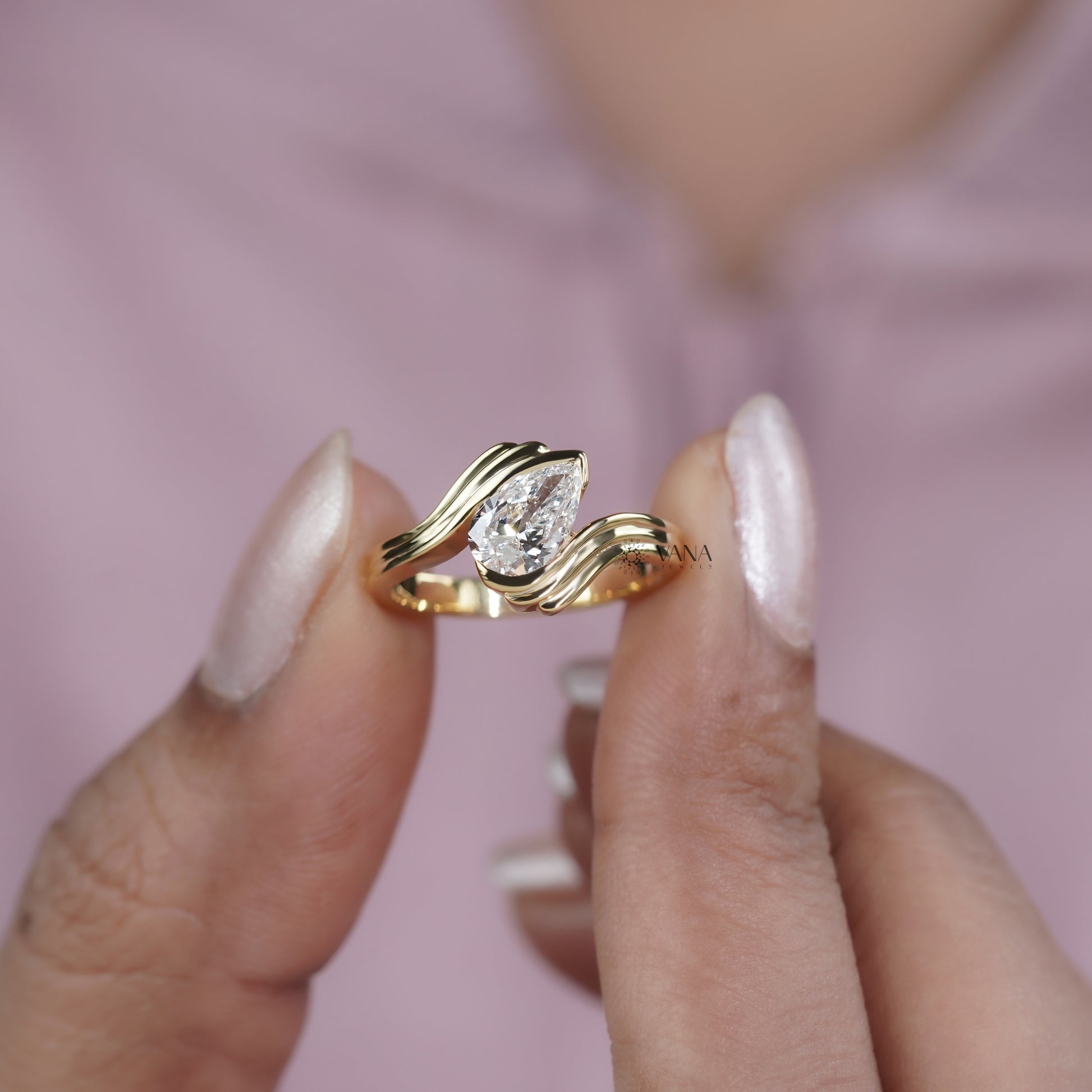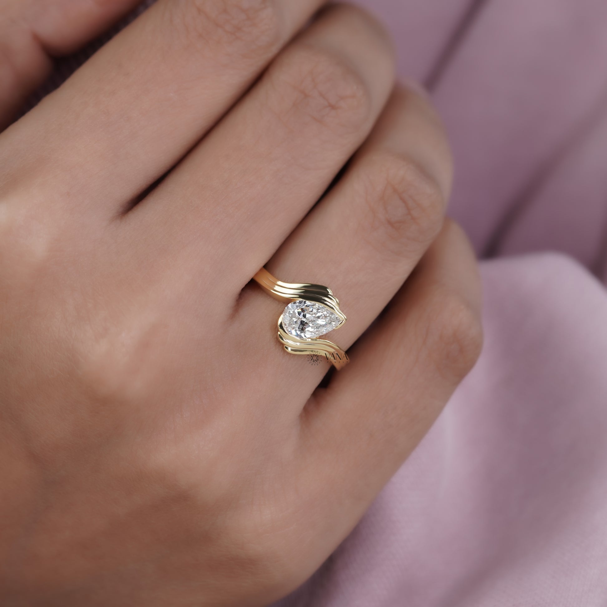 This elegant bypass ring features a brilliant pear cut lab grown diamond wrapped in a smooth, flowing wave inspired design. Crafted in solid 14K yellow gold, the bypass setting embraces the diamond beautifully, giving the ring a modern and artistic look. The sleek triple-band curve enhances the sparkle of the center stone while offering a unique, contemporary style that stands out from traditional engagement rings. Comfortable for everyday wear and perfect for those who love bold, stylish jewelry, this ring symbolizes movement, connection, and a love that never stops growing.