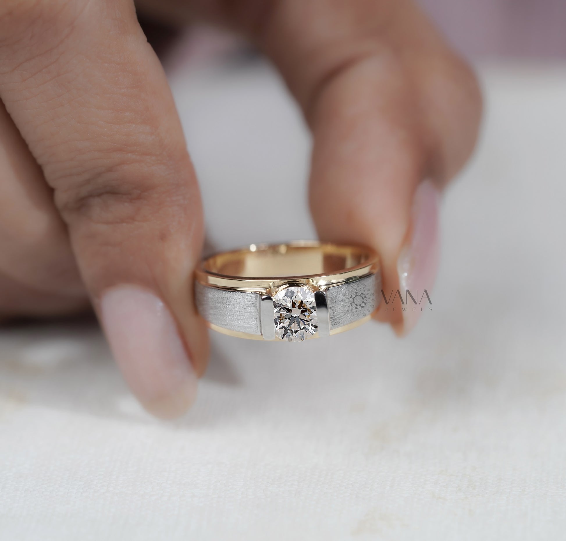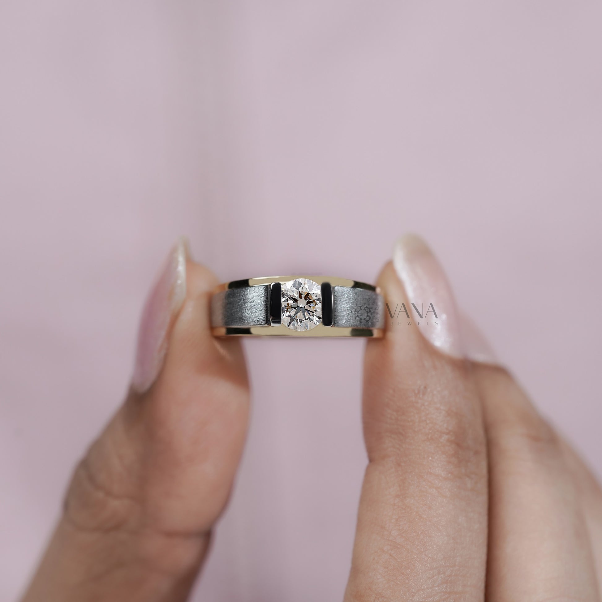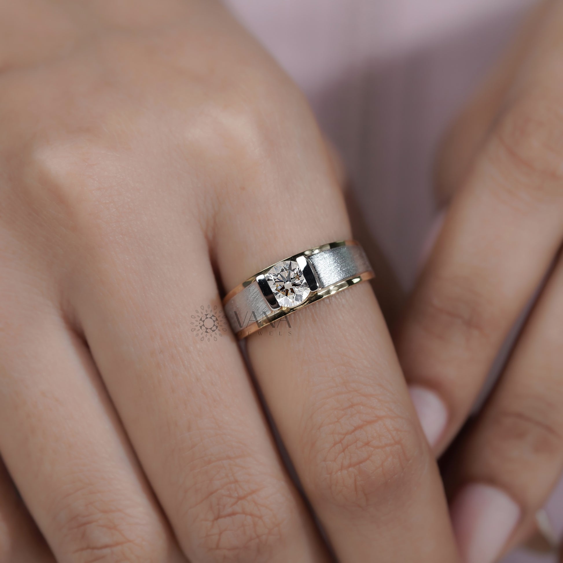 This men’s lab grown diamond ring features a brilliant round cut center diamond securely bezel set in a bold two tone gold band, combining yellow and white gold for a modern luxury look. Crafted for everyday elegance, this eco friendly and conflict free diamond ring offers the same sparkle as mined diamonds while being sustainable and affordable, making it the perfect engagement ring, anniversary gift, or statement jewelry for today’s confident man.