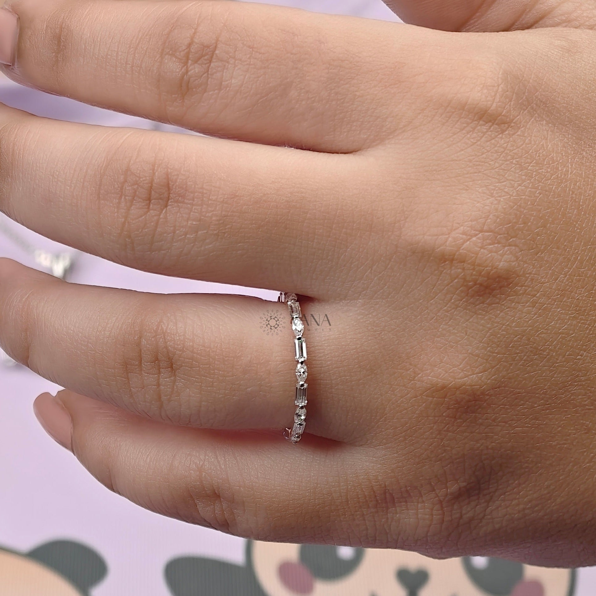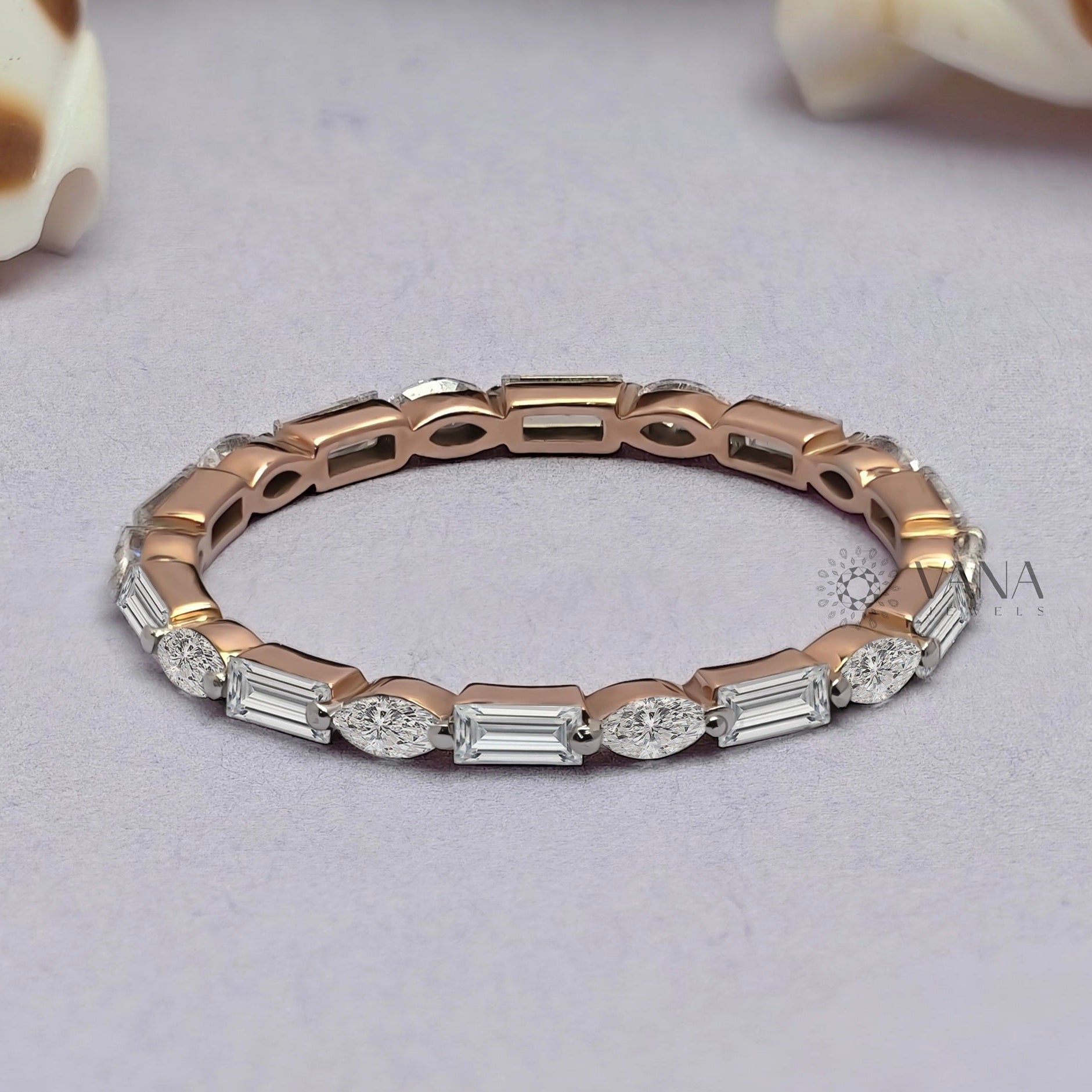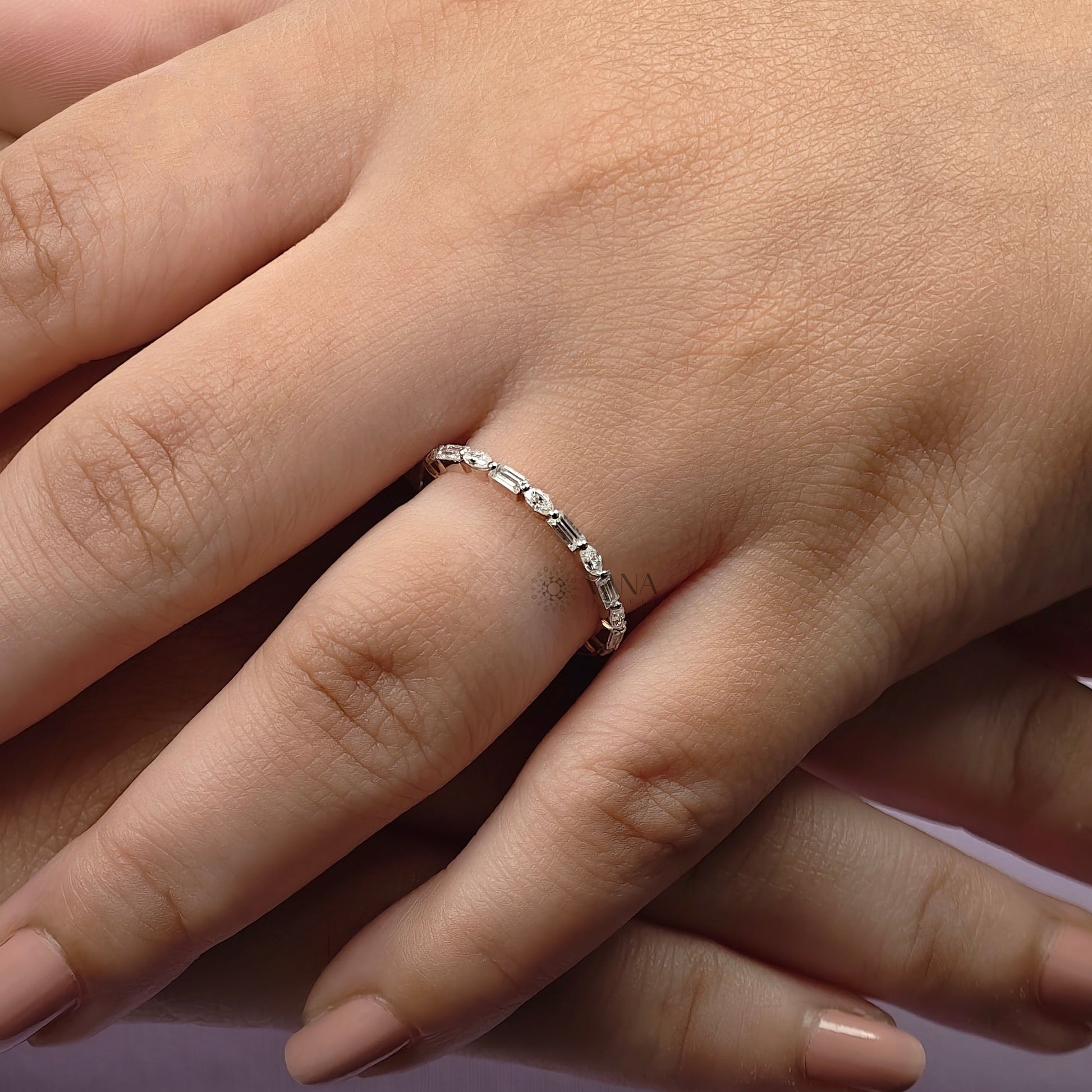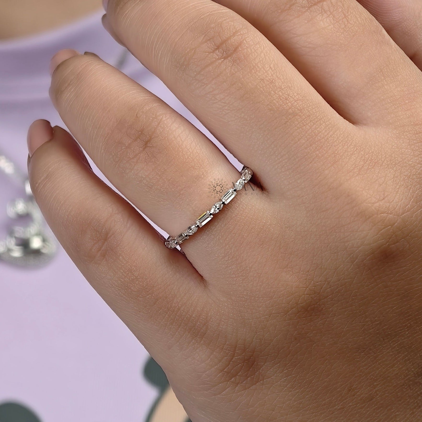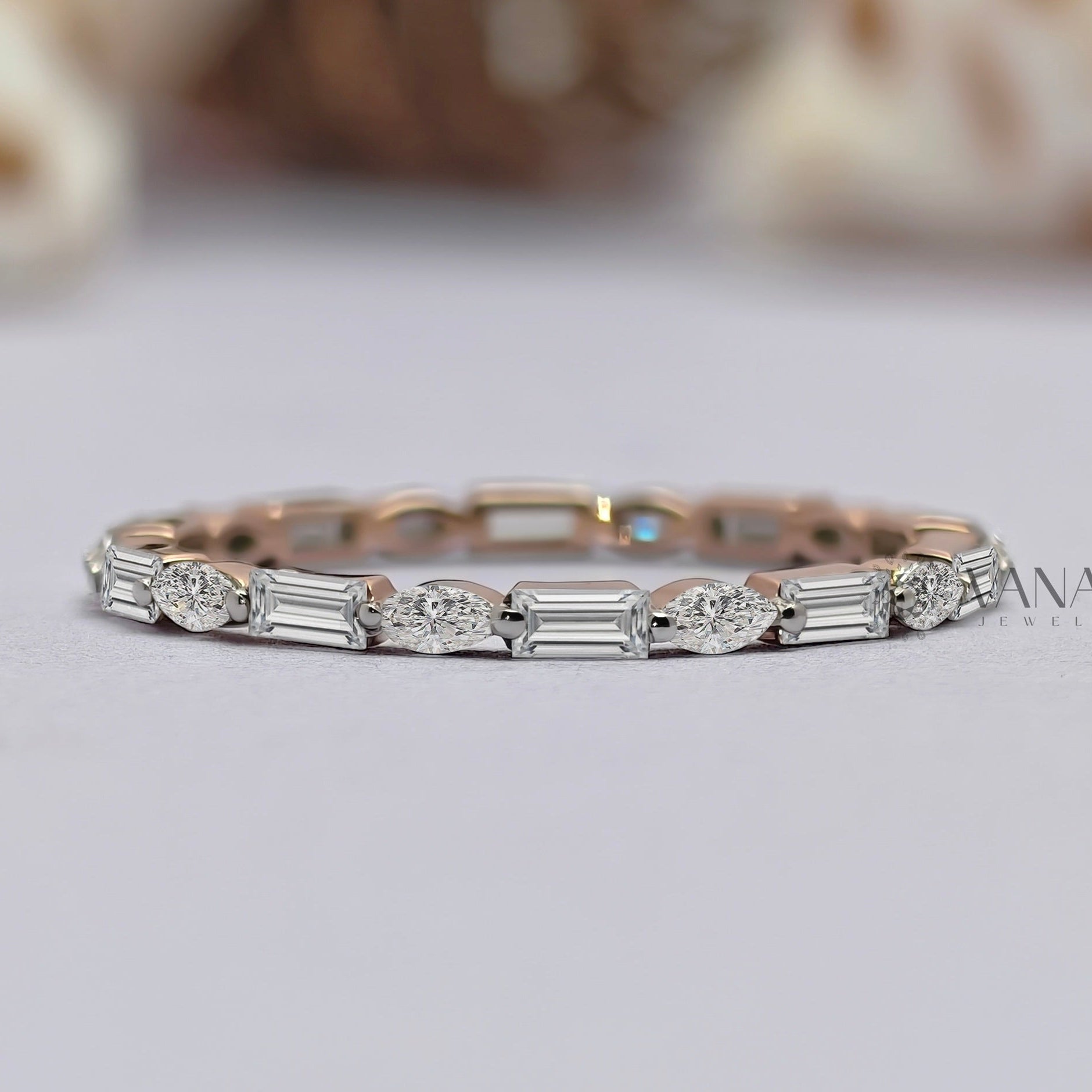 This elegant baguette and marquise cut moissanite eternity wedding band features a refined combination of sleek lines and soft curves for a modern yet timeless look. Crafted in romantic rose gold, the alternating stone shapes create delicate sparkle while maintaining a minimalist aesthetic. Designed to stack effortlessly or pair as a matching band for bridal sets, this dainty ring is perfect for everyday wear. Ideal as a wedding band, anniversary ring, or thoughtful gift, it’s made for women who love subtle luxury and graceful design.