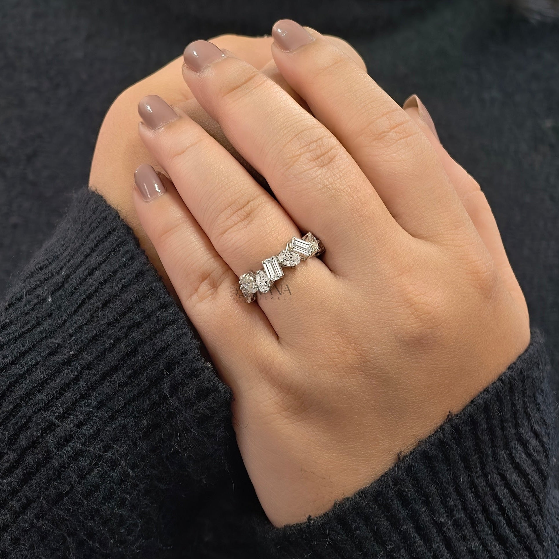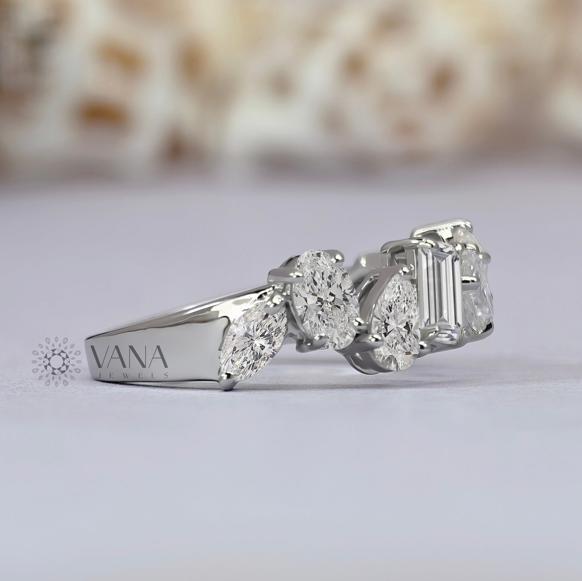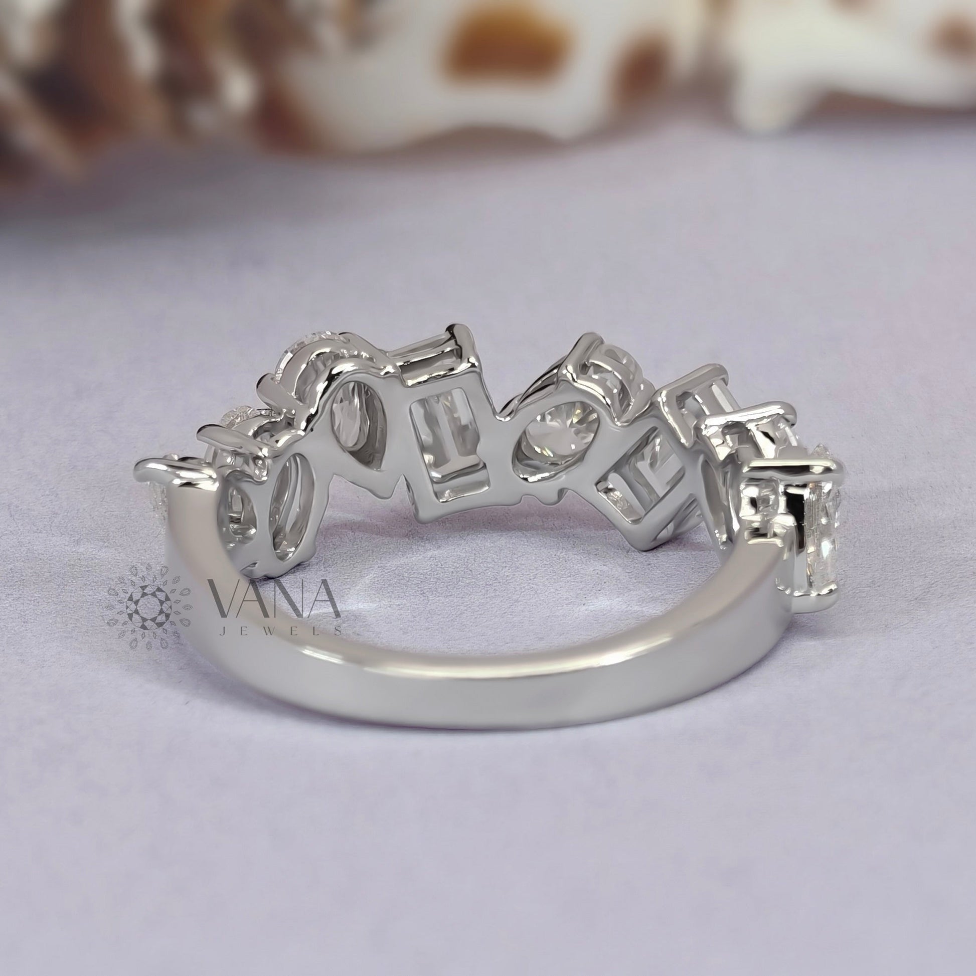 This stunning mixed cut moissanite wedding band showcases a graceful combination of pear, marquise, emerald, and oval cut moissanite stones, creating a unique and modern half eternity design. Set in luxurious 18K white gold, each stone is carefully placed to maximize brilliance and sparkle from every angle. Perfect as a stackable wedding band, anniversary ring, or statement piece, this handcrafted band blends contemporary elegance with timeless beauty. An ideal gift for celebrating love, milestones, and special moments.