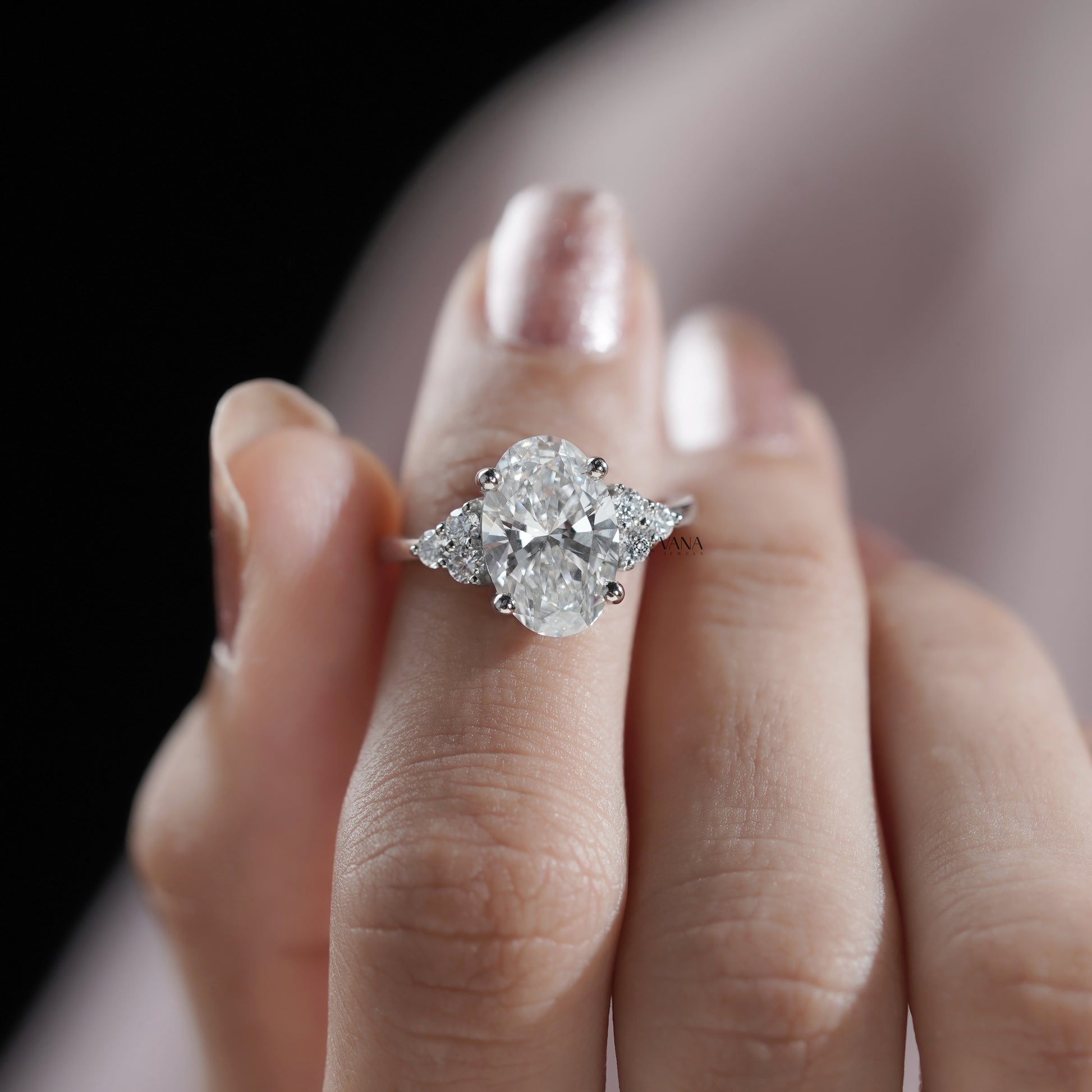 This beautiful engagement ring features a brilliant oval cut lab grown diamond set in a classic four-prong setting, highlighted by sparkling round side stones that add extra shine and elegance. Crafted in premium 14K white gold, the smooth band offers comfort while enhancing the brilliance of the diamonds. The balanced design blends modern luxury with timeless charm, making it a perfect choice for engagements, proposals, and special moments. Its graceful sparkle and refined craftsmanship create a stunning symbol of love that will be treasured forever.