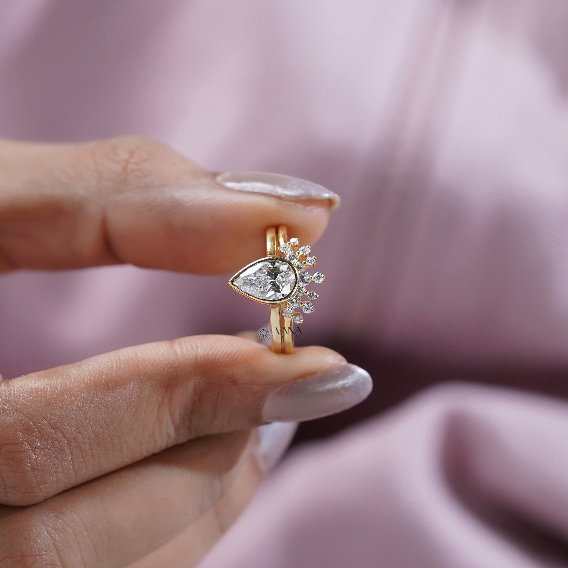 A stunning pear-cut bezel set engagement ring paired with a sparkling curved wedding band, crafted with brilliant lab-grown diamonds for an ethical and luxurious bridal look. The elegant teardrop center stone sits securely in a sleek bezel, while the matching contour band adds radiant symmetry. Perfect as a bridal set, anniversary gift, or timeless keepsake, this handcrafted design blends modern beauty with classic sophistication.