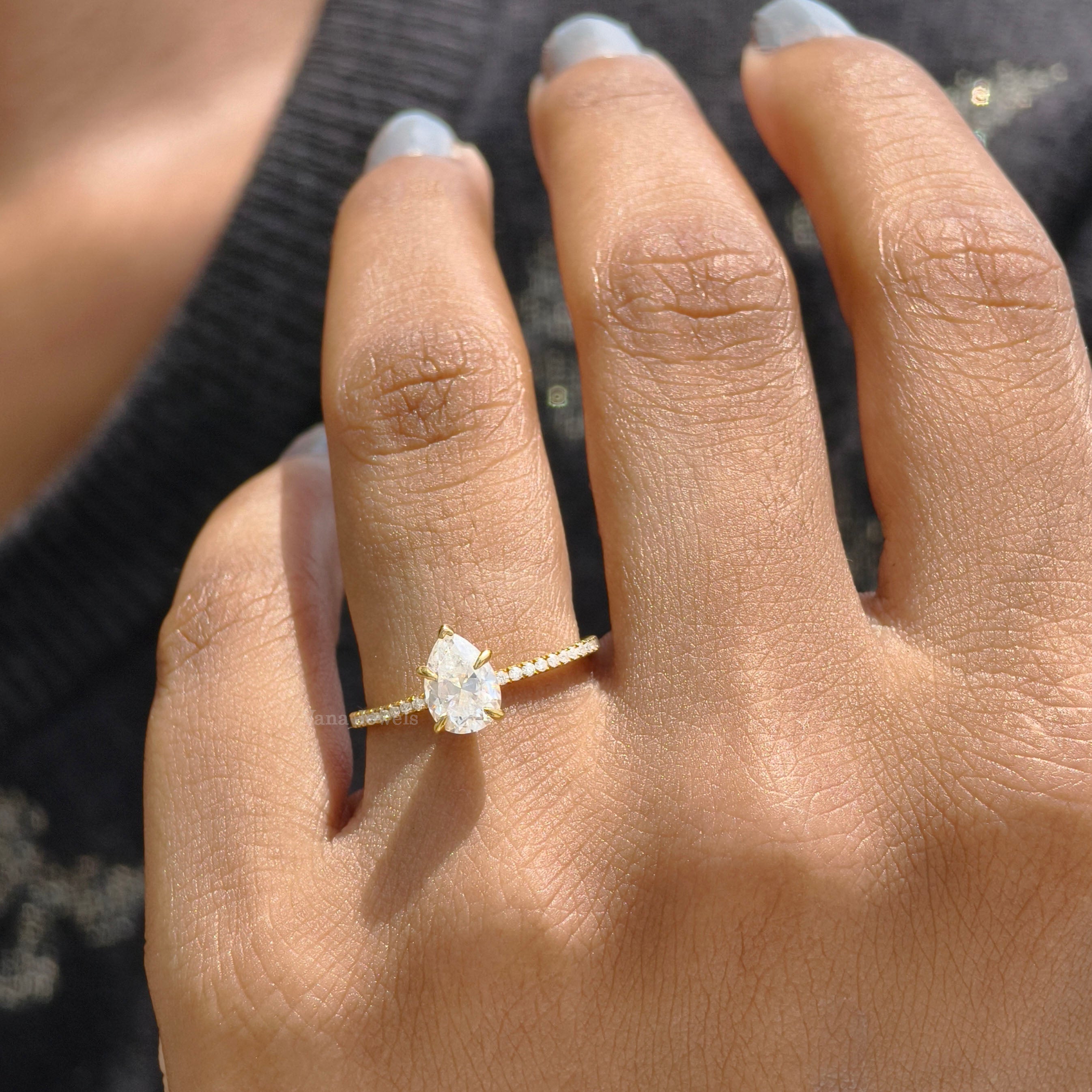 The Pear Cut Moissanite Engagement Ring is an exquisite choice for your special moment. This pave set ring combines elegance with a touch of sparkle, making it the perfect engagement gift.