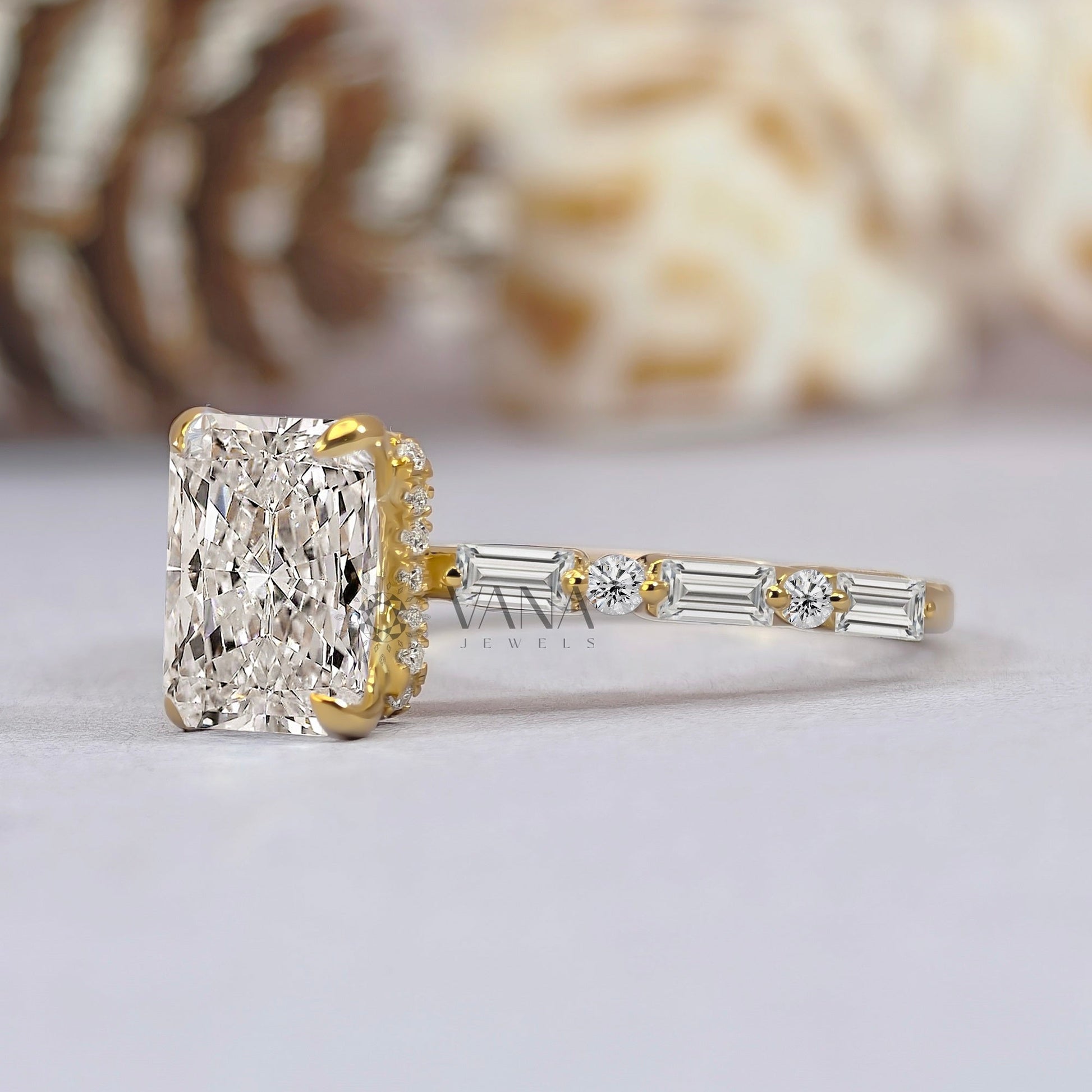 Radiant Cut Moissanite Engagement Ring with Baguette & Round Side Stones