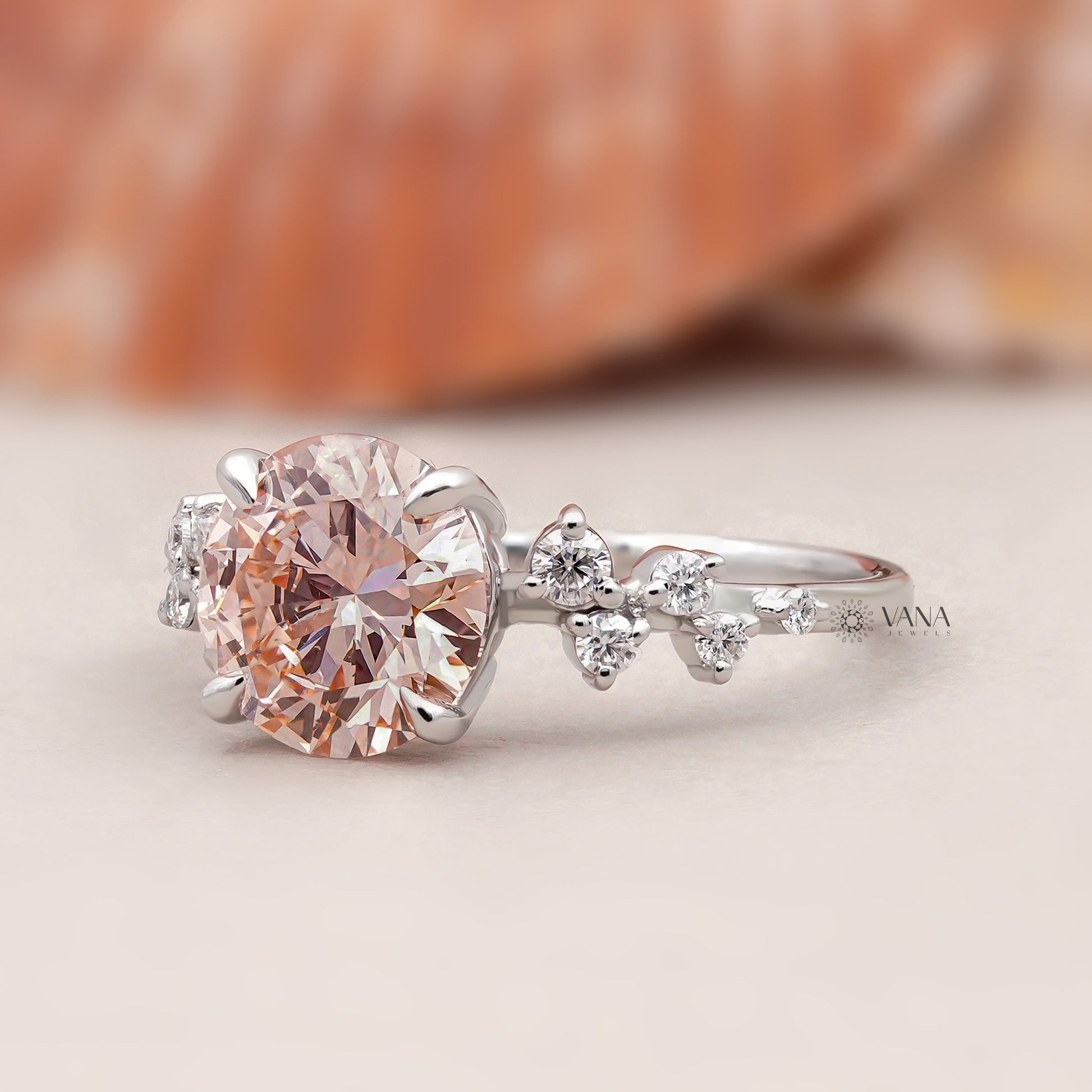 Unique Round Cut Lab Grown Diamond Engagement Ring with Cluster Side Stones in Solid Gold