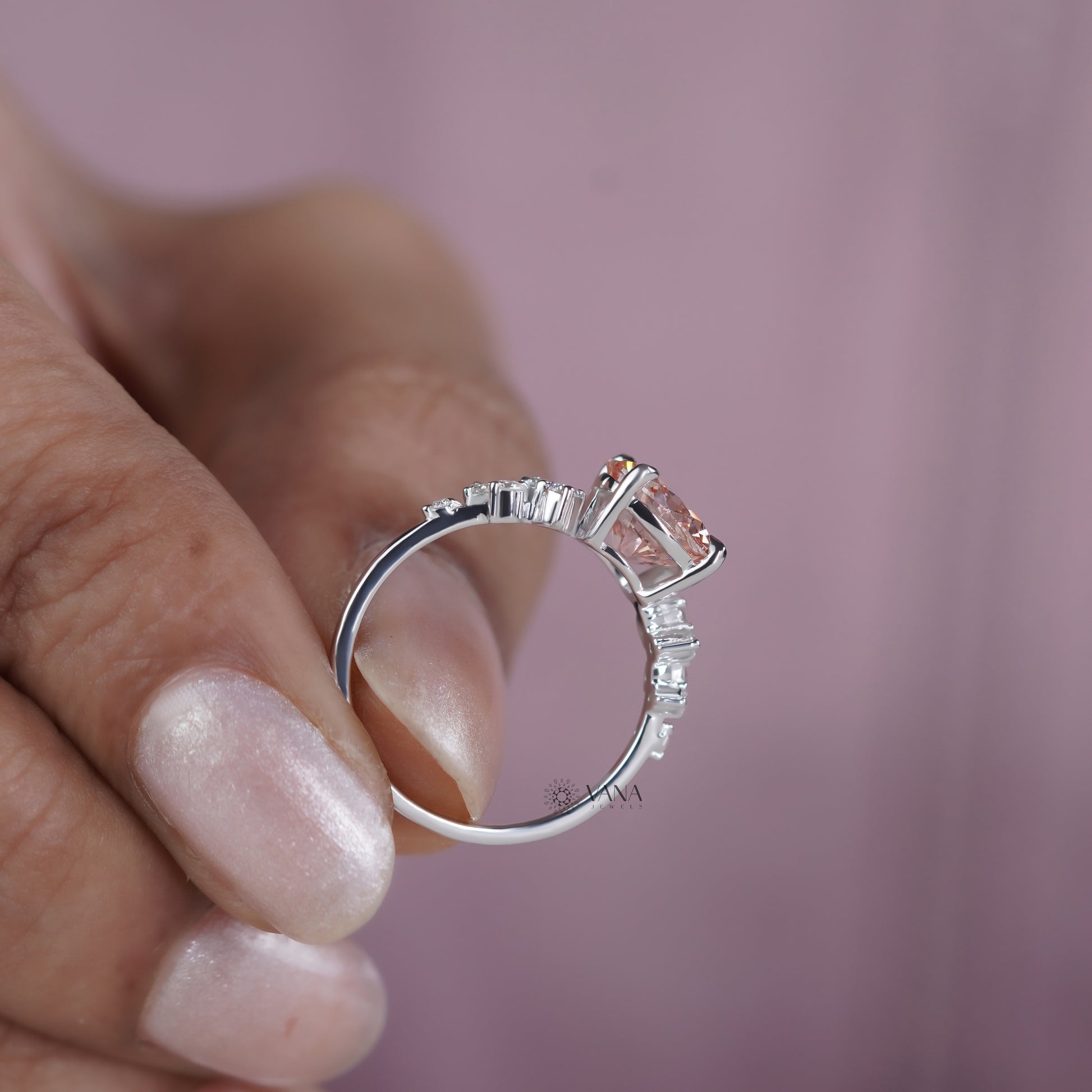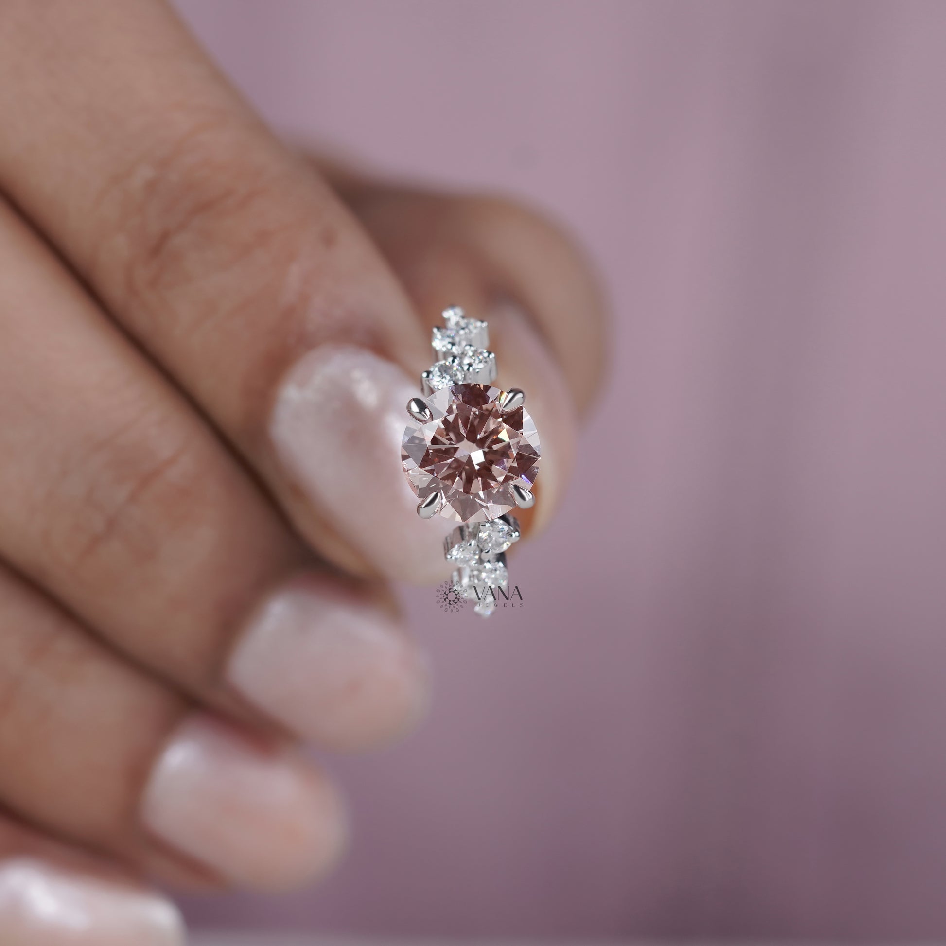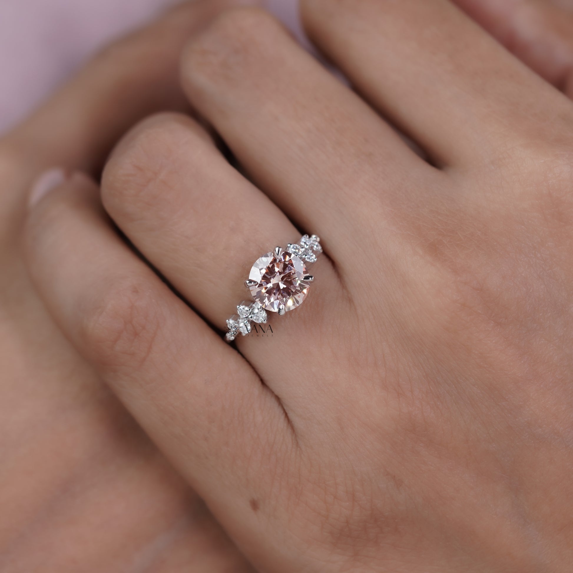 This unique engagement ring showcases a brilliant round cut lab grown diamond secured in a classic prong setting, enhanced by delicate cluster-style side diamonds for added sparkle and dimension. The elegant design blends timeless beauty with modern craftsmanship, creating a romantic look that shines from every angle. Perfect for engagements, weddings, anniversaries, or proposals, this lab grown diamond ring is ethically crafted and designed to be cherished for a lifetime.