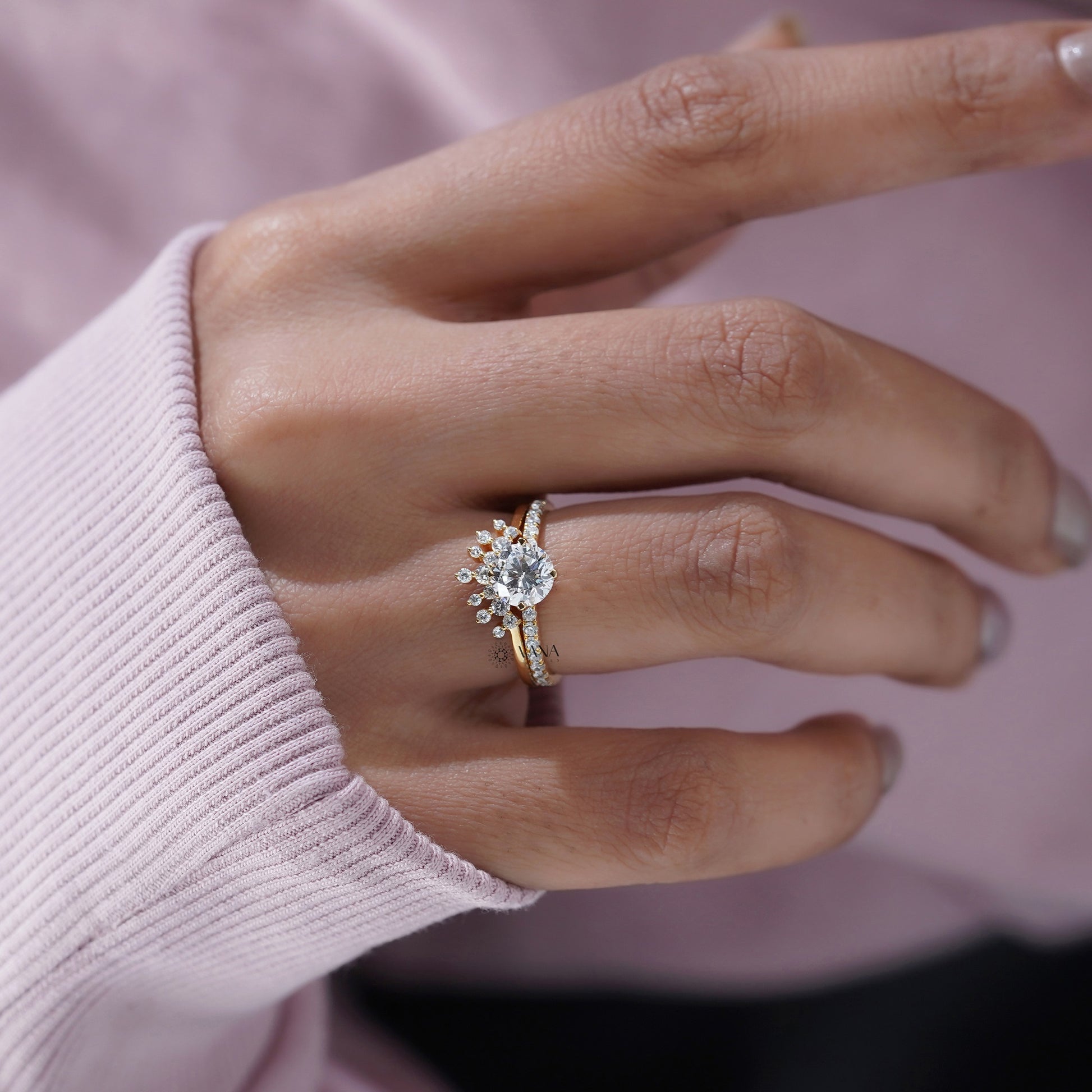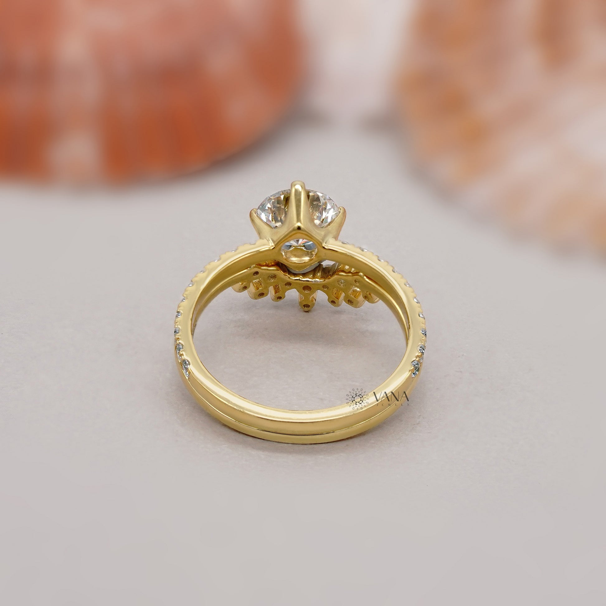 Round Diamond Engagement Ring Set with Tiara Wedding Band for Women
