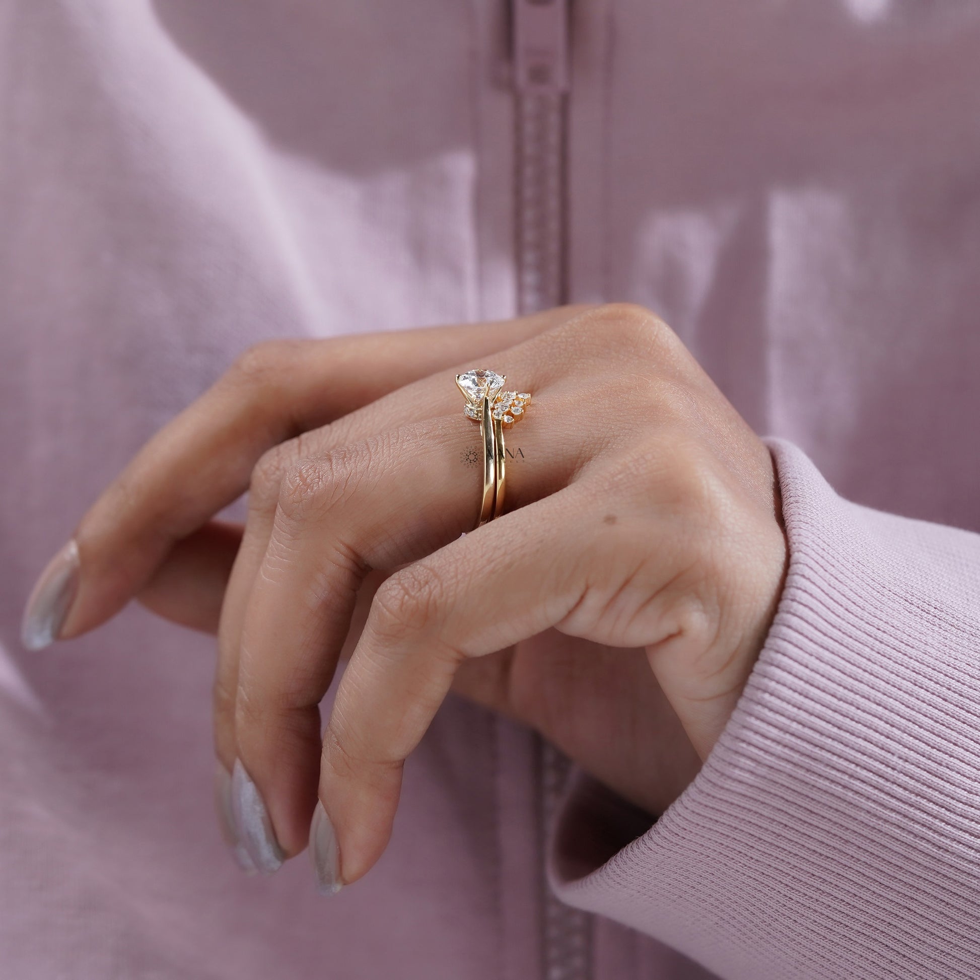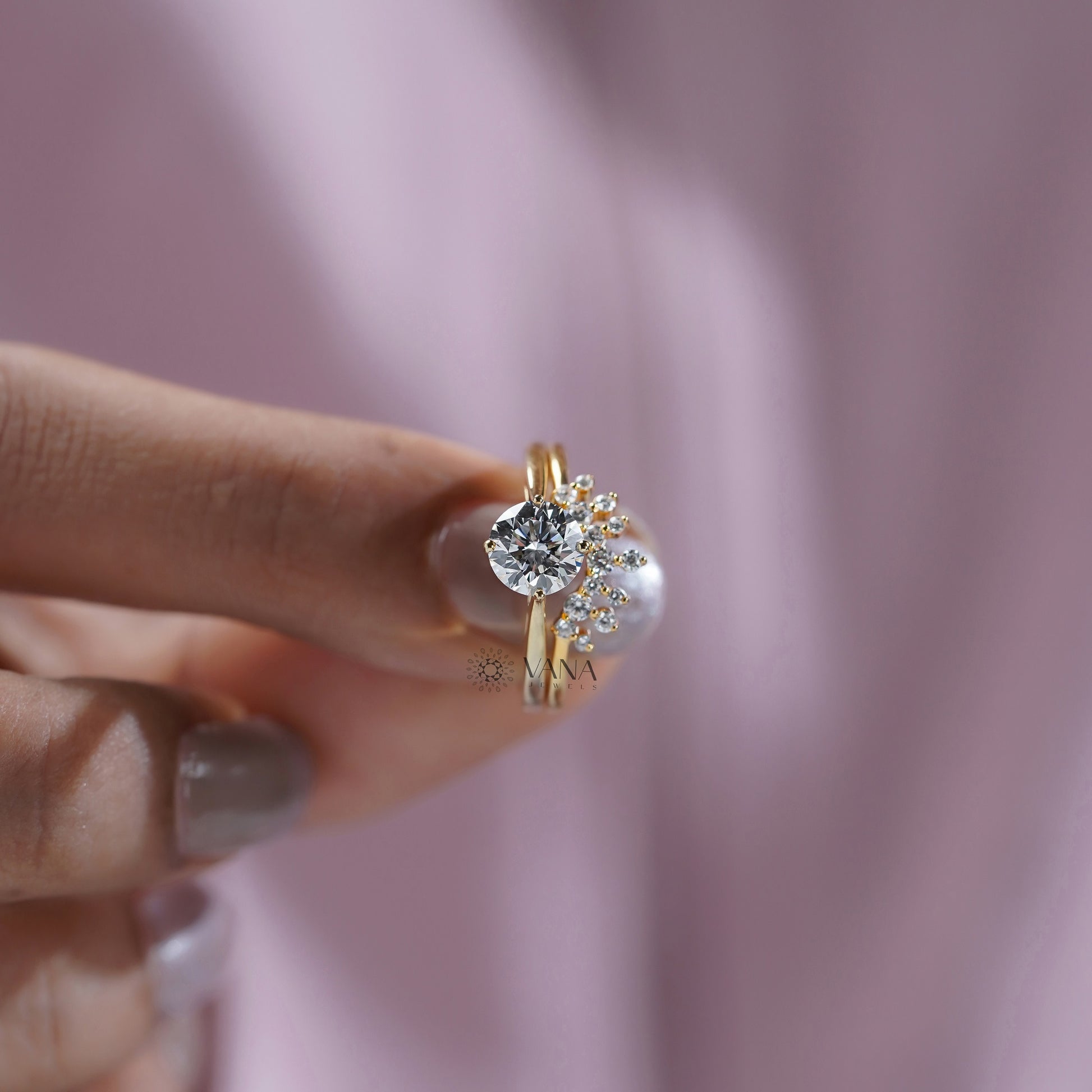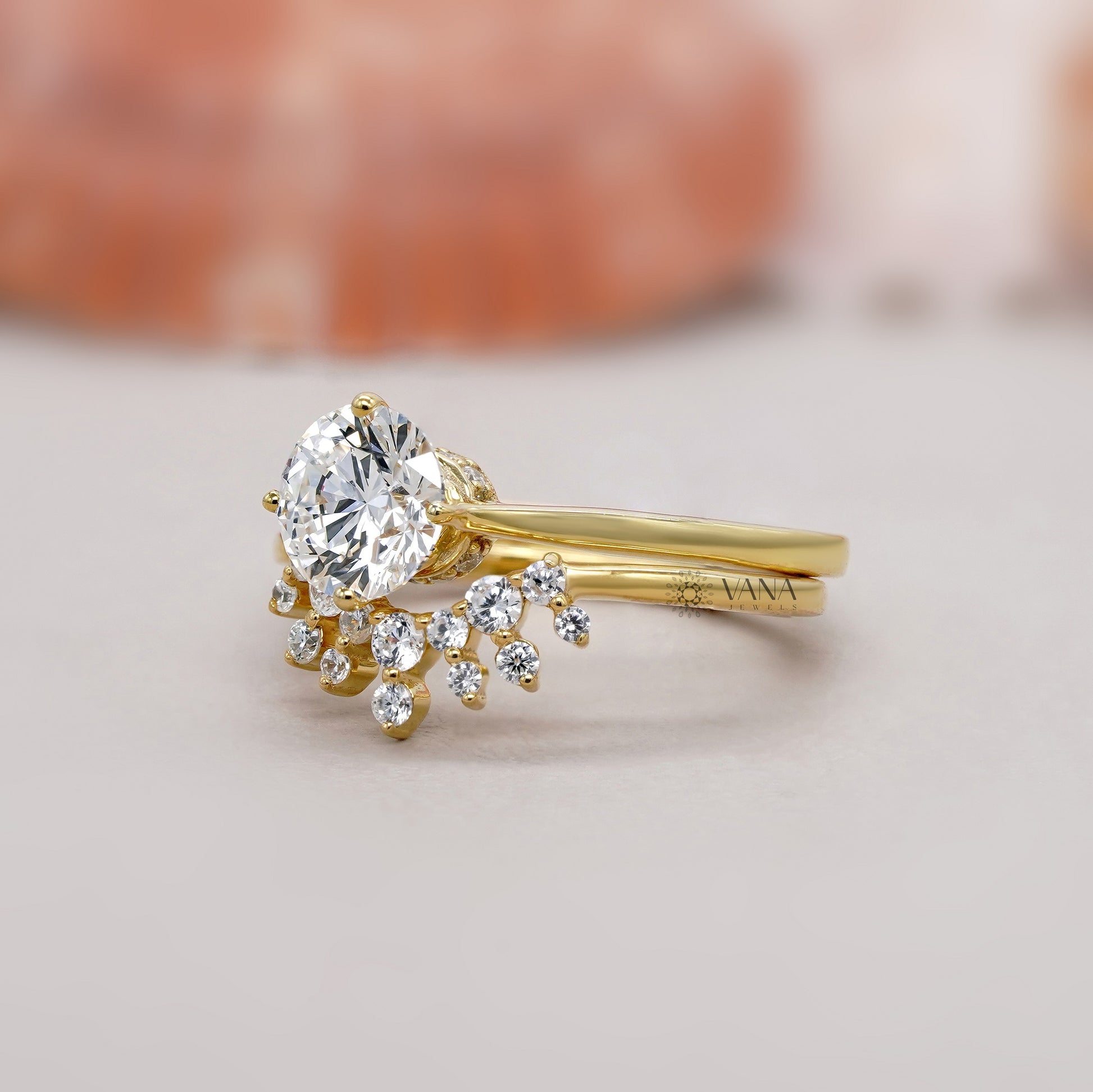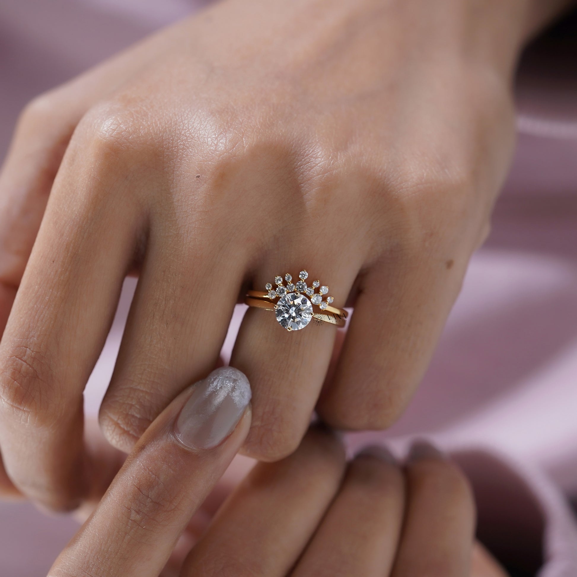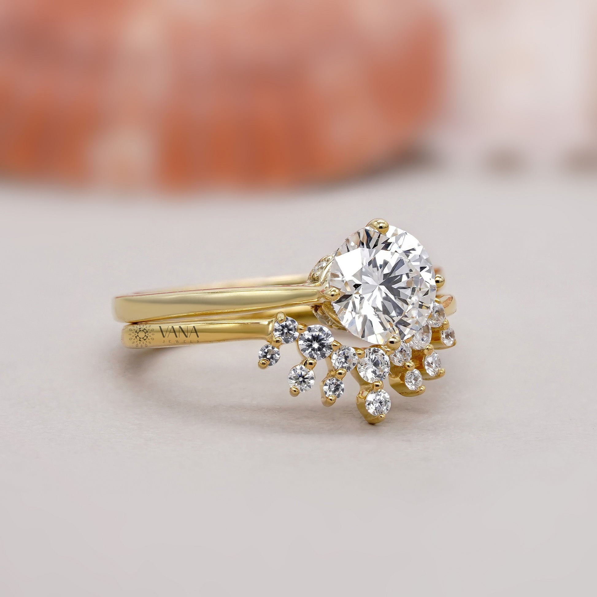 This elegant bridal ring set features a brilliant round cut lab grown diamond solitaire paired with a beautifully designed tiara-style wedding band that adds a royal touch of sparkle. Crafted in solid 14K yellow gold, the engagement ring showcases a classic solitaire setting while the curved tiara band is adorned with shimmering round diamonds that nest perfectly beneath the center stone. Designed to complement each other seamlessly, this timeless ring set is ideal for engagements, weddings, anniversaries, or meaningful milestones, offering lasting beauty, comfort, and brilliance.