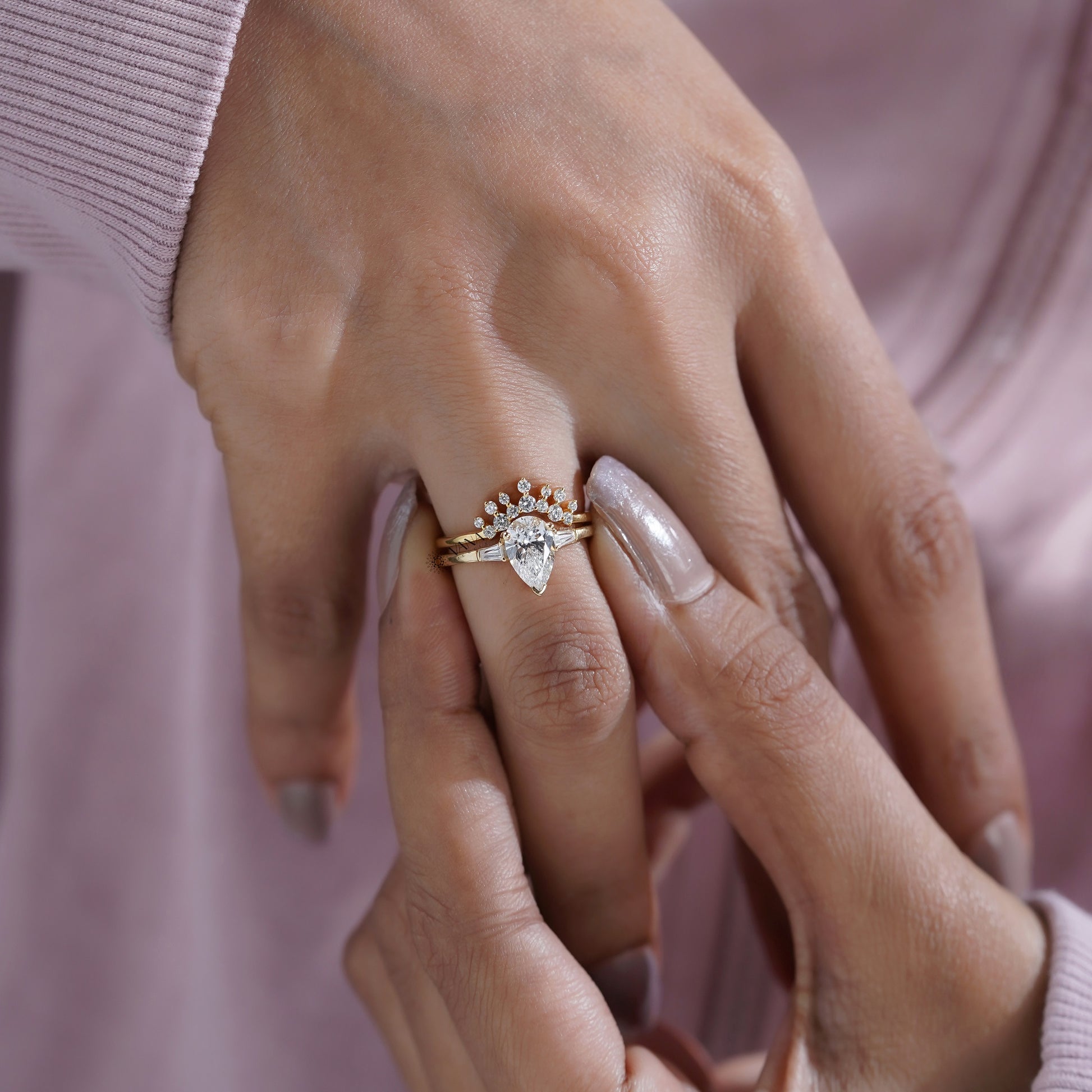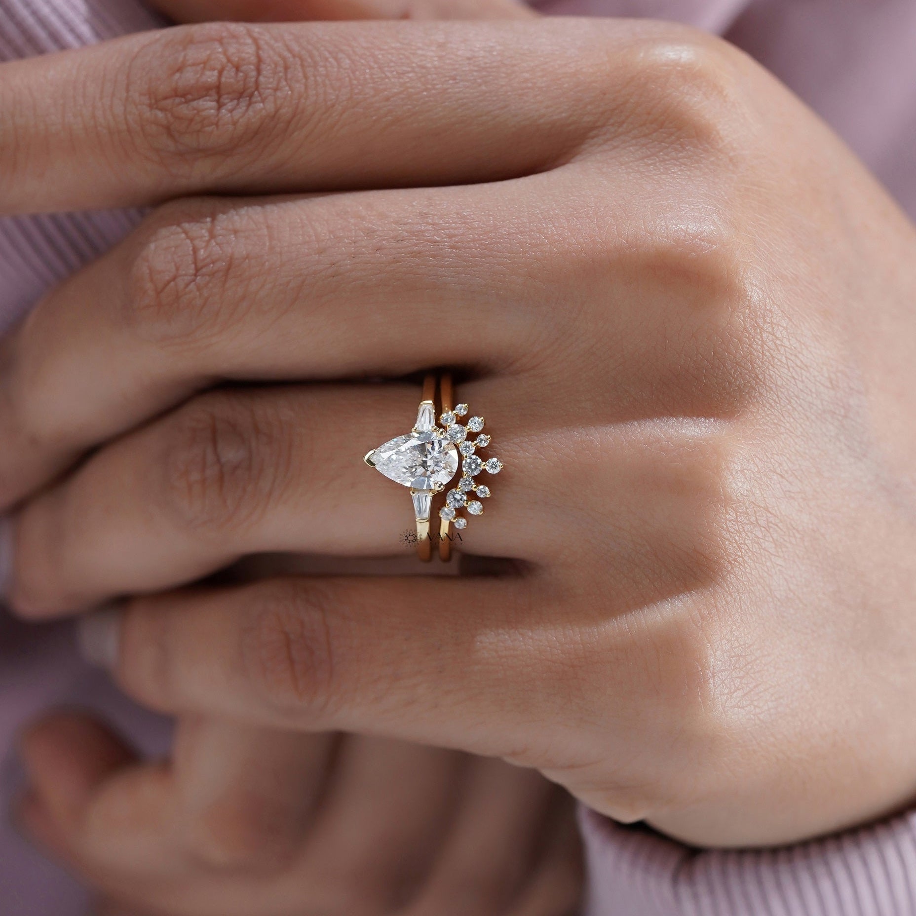 This elegant bridal ring set features a brilliant pear cut lab grown diamond at the center, accented by tapered side stones in a classic three stone design. Paired with a beautifully curved diamond wedding band, the set is crafted to sit flush and enhance the sparkle of the engagement ring. Made in solid gold with fine detailing and balanced proportions, this timeless lab grown diamond ring set is perfect for engagements, weddings, or anniversaries, offering lasting beauty and modern luxury.