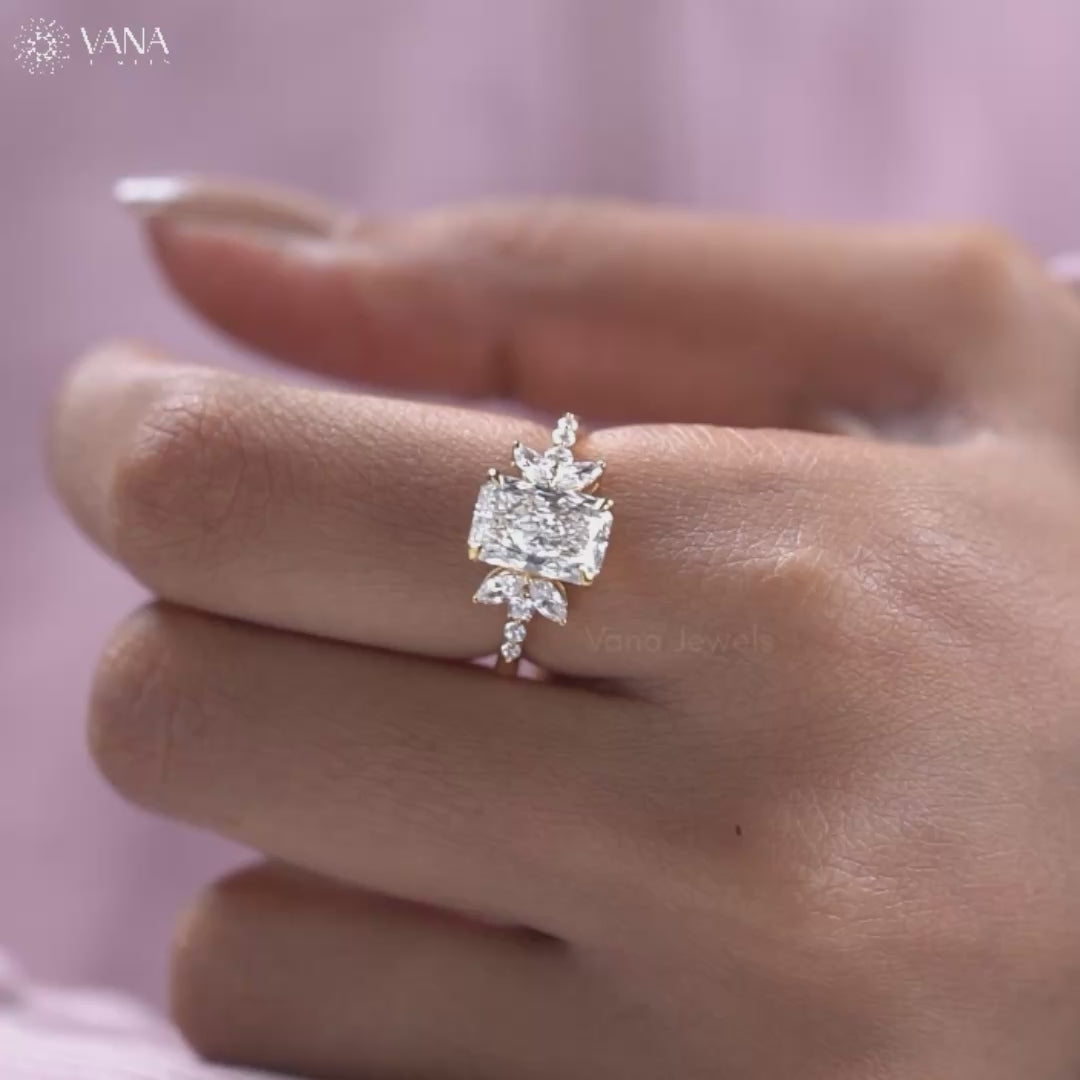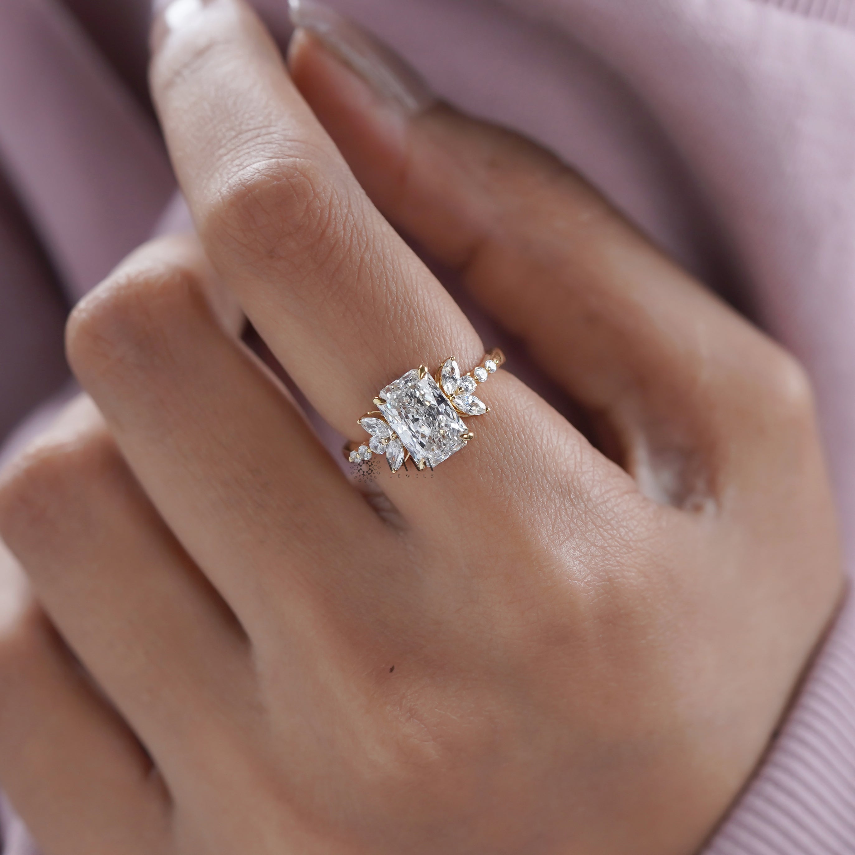 Floral Radiant Cut Diamond Cluster Engagement Ring with Marquise & Round Side Stone