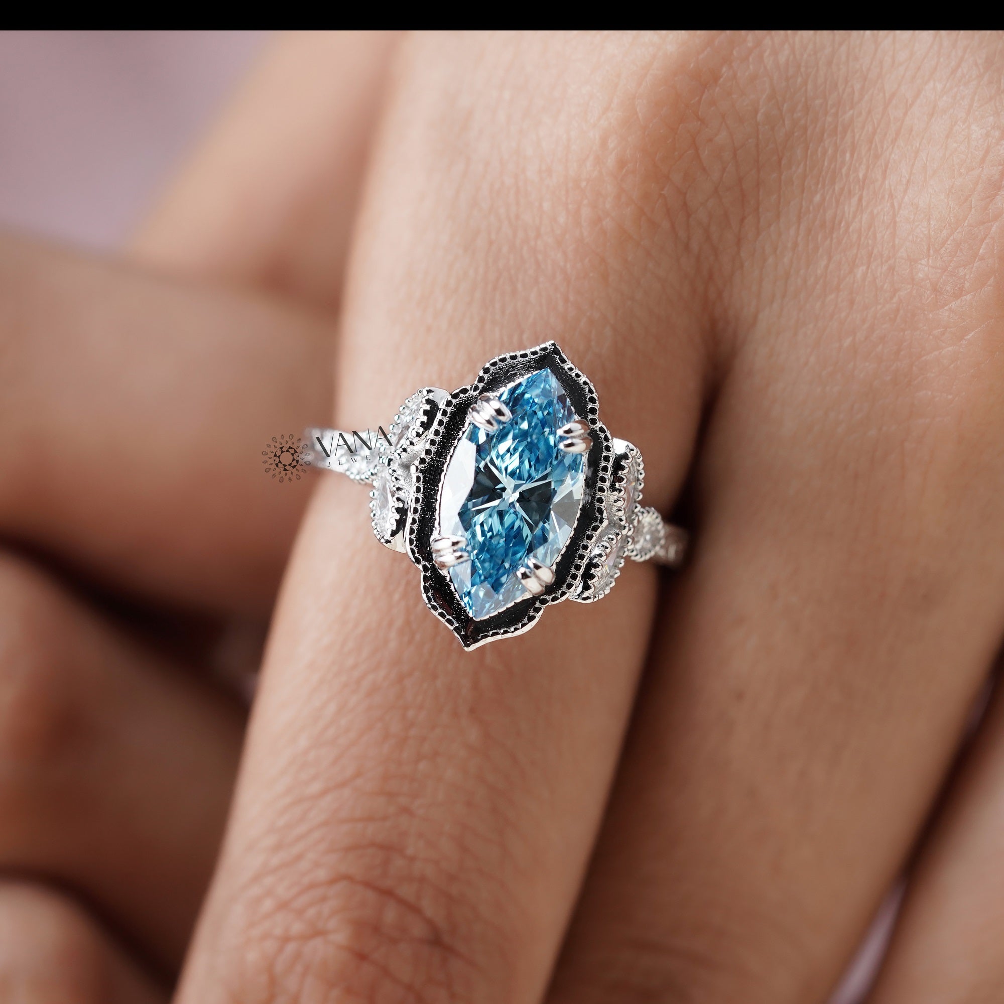 This stunning vivid blue marquise cut lab grown diamond engagement ring is a true statement of elegance and individuality. Set in luxurious white gold, the center stone is framed by a delicate halo and intricate vintage-inspired detailing that enhances its brilliance With Double claw prong and milgrain setting a Perfect for engagements, anniversaries, or Christmas gifting, this handcrafted bridal ring blends timeless beauty with modern luxury.